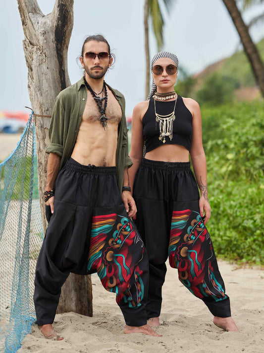 With our Savage Spirit Unisex Harem Pants, light up the dance floor and embrace the adventure. These unisex harem Pants , designed for everyone who want a dynamic blend of style and usefulness, have multicolored, furious tribal face painting that exudes a ferocious and powerful look that's ideal for dancing, yoga, and travelling.