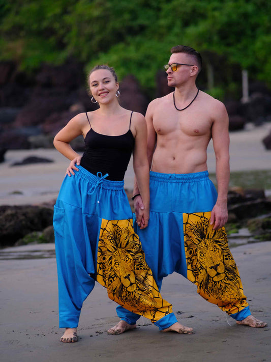Pack of 2 Unisex Couple Bohemian Lion Print Hippy Baggy Aladdin Harem Pants For Travel Dance Yoga