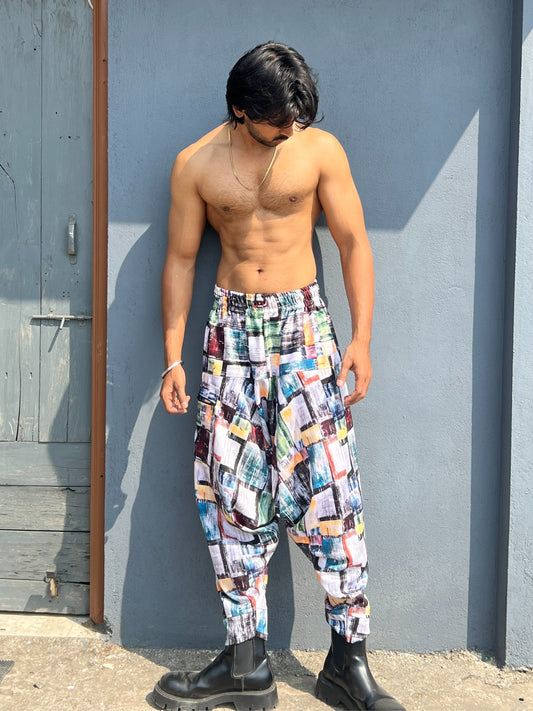 Men’s Multicolor Abstract Print Harem Pants – Free Size Boho Style for Dance, Travel & Yoga