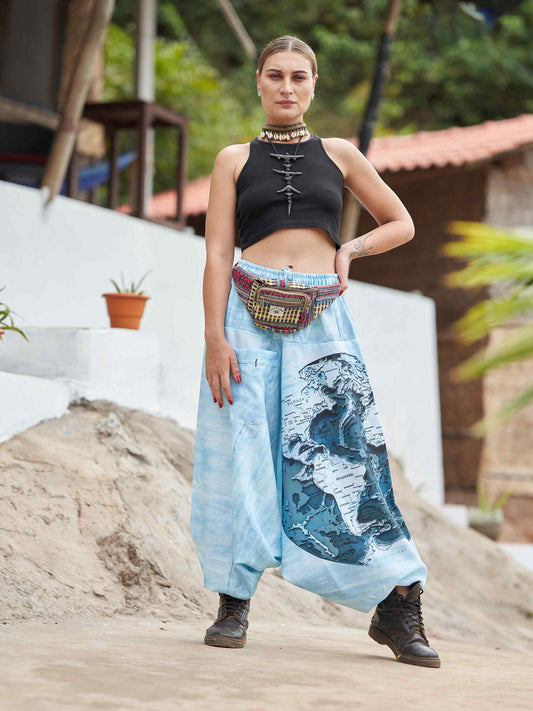Women's World Map Print Hippy Aladdin Balloon Pyjamas Harem Pants For Travel