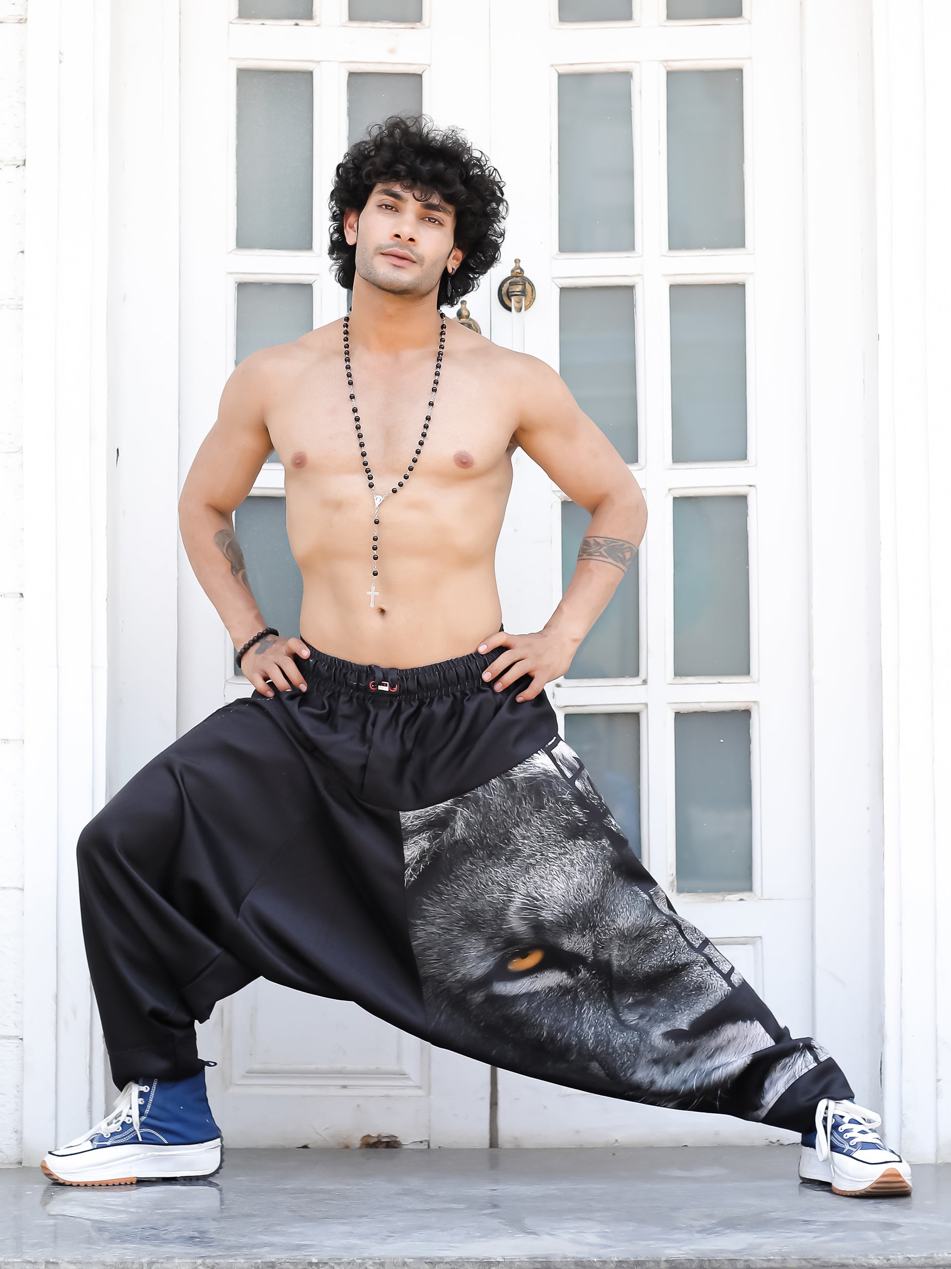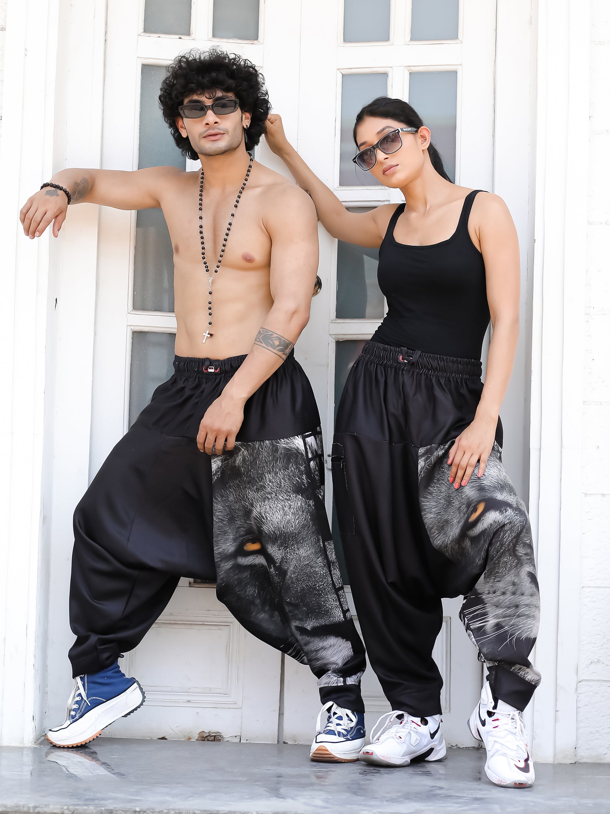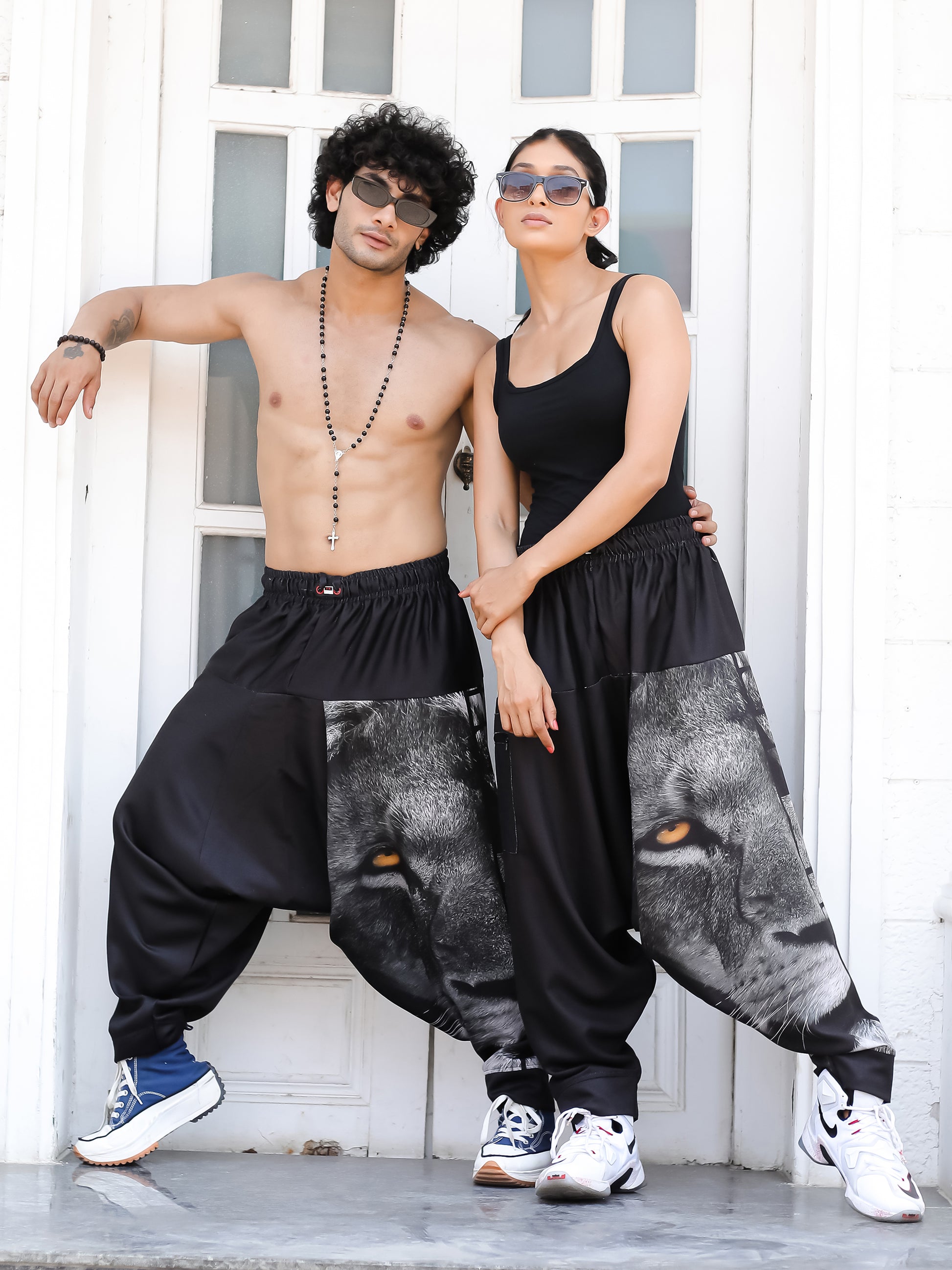 Take on a voyage of empowerment and movement by donning our Men's Dhoti Harem Pants, Roar & Rise. These sexy black genie trousers serve as more than simply clothing; they are an inspiration. These gelyu harem have a unique pattern that features half a ferocious lion face with bright yellow eyes and inspirational words in black and white on the other half. The overall effect is elegant and inspiring.